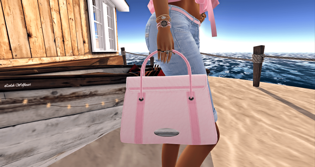 nothing is more relaxing then to sit there with a view to the water, and when my world in RL is foggy and cloudy with rain, then in Second Life you can enjoy the weather you would like to have outside and dream you to places you would like to be. During my relaxing dream time I wear ‘Ember’ the new outfit that Apple Heart Inc. has for us to enjoy the spring time that is hopefully blossing outside. You can get it @ the actually running round of Designer Circle 174 and you get some nice Boxer Shorts, a pretty pink shirt with hud function to add some nice blossoms on it in variable versions, pretty pink wedges, nice double bend watch and a pretty pink handbag to get your outfit ready. It feels so comfy and light it is fun to wear after the cold time with heavy boots and thick jackets to keep us warm in the cold weather. The sizes are for Belleza, Slink and Maitreya. With it I am also wearing a sweet heart necklace that you also get at the Desinger Circle. It is from Indulge Temptation and it matches great with the outfit from Apple Heart. So hurry up and get your spring outfit *smiles*