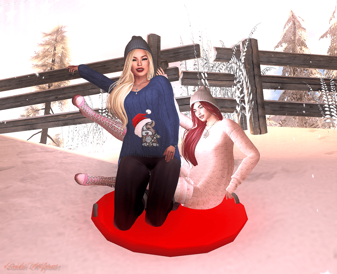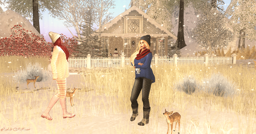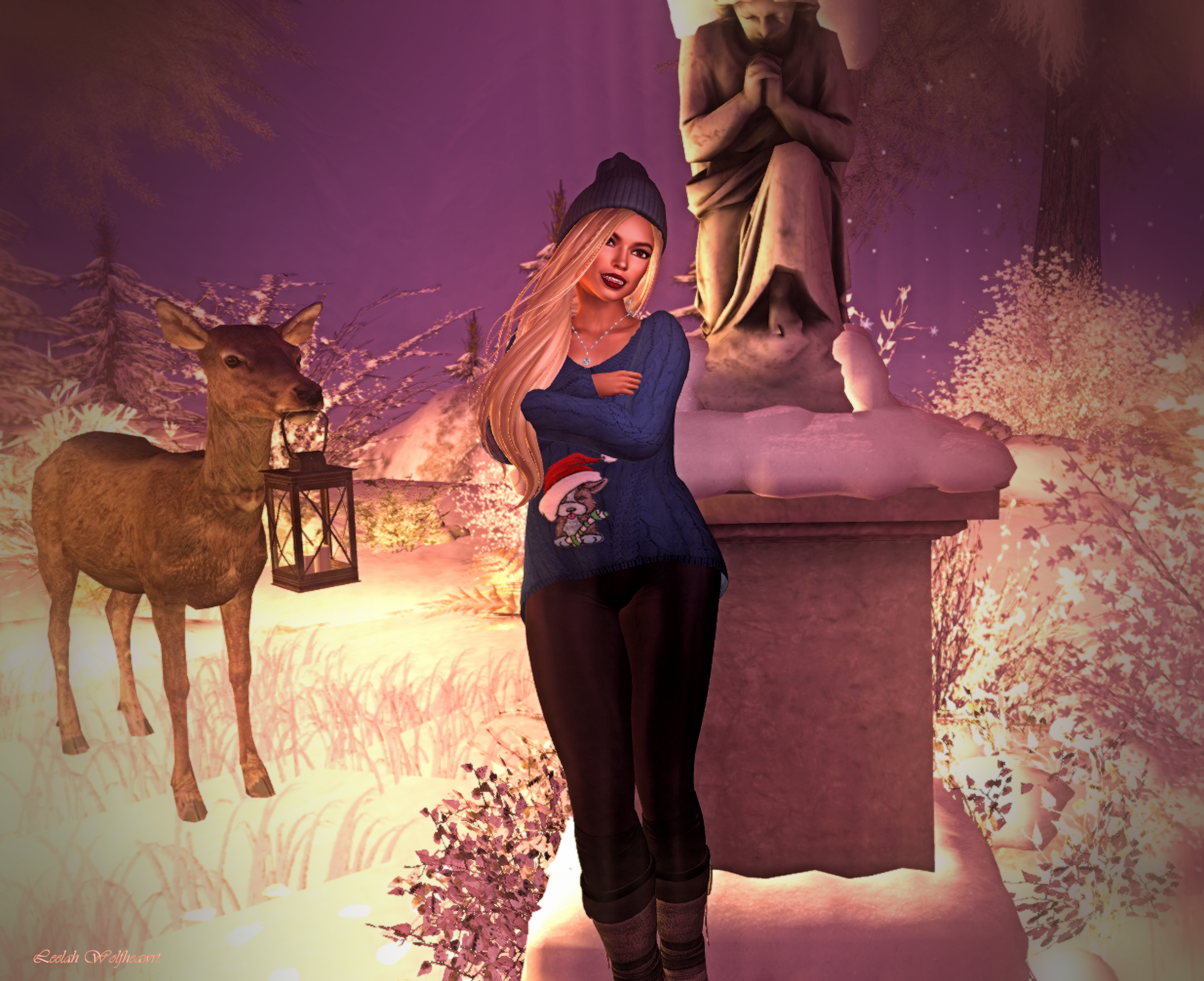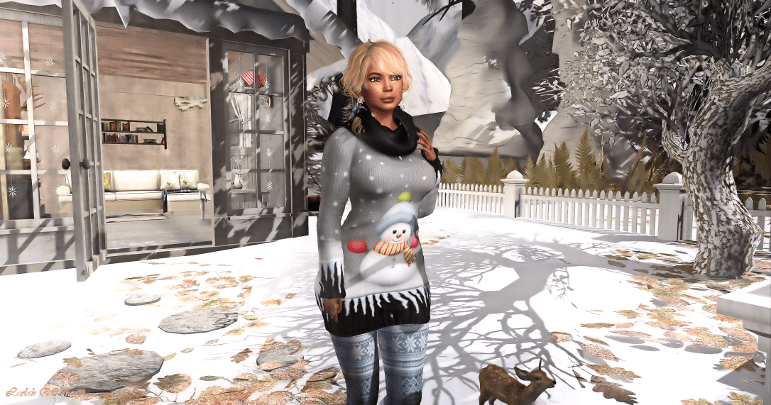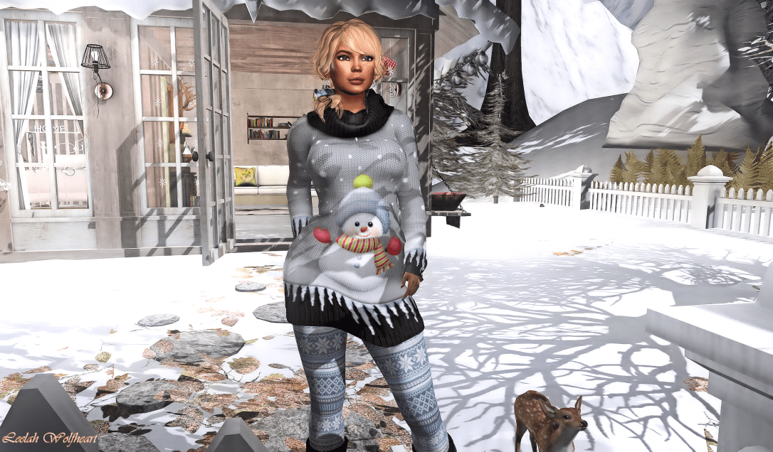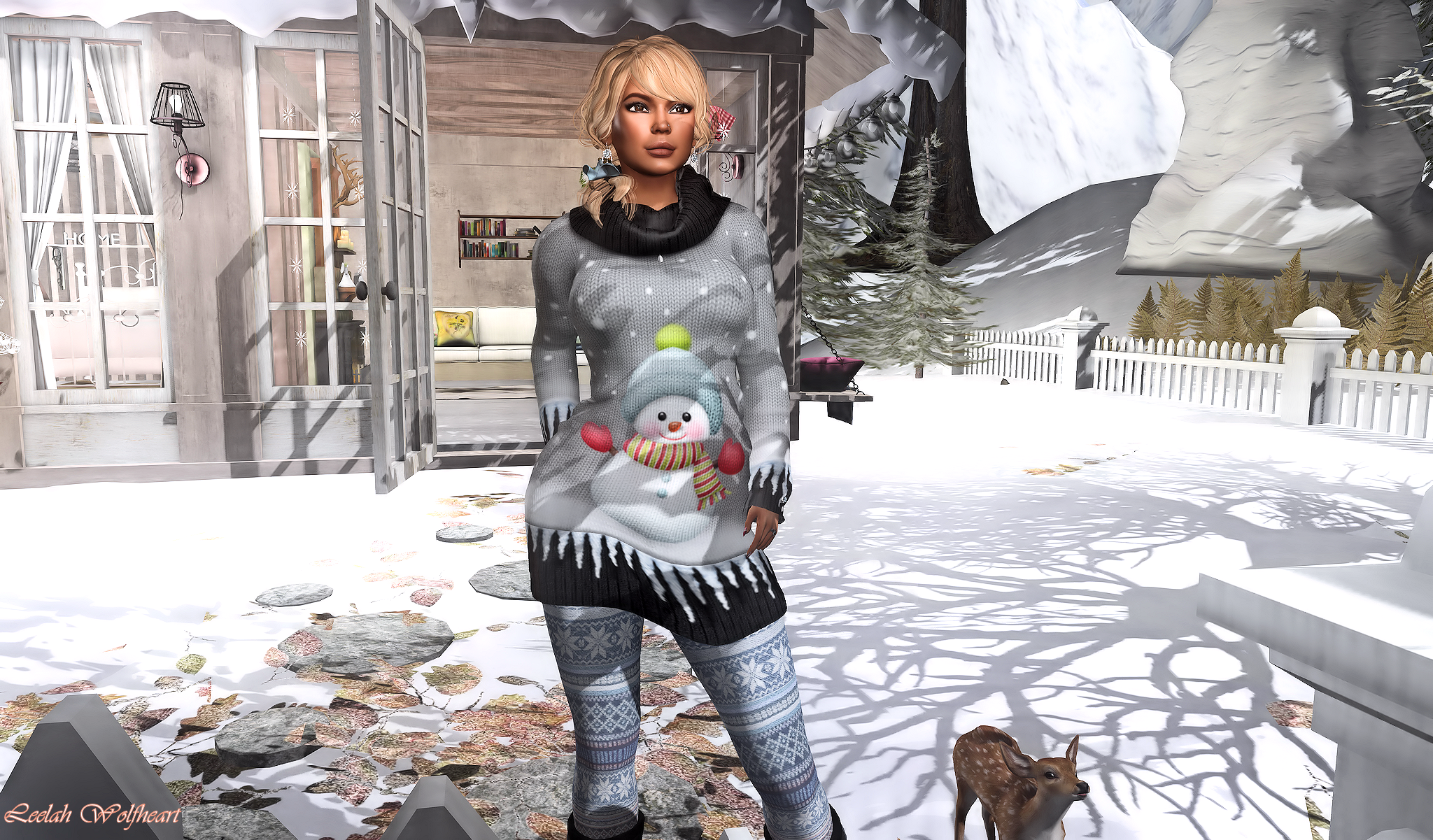 da im Moment mal wieder die Schneeflocken bei mir fallen möchte ich Euch ein nettes Dress mit dem Namen ‘Carrol Sweater Dress’ zeigen, es ist von Desmonia und beinhalted einen Hud mit dem Ihr das Aussehen verändern könnt. I hab es heute angezogen um einen heißen Kaffee mit meinem süßen Bambi zu trinken bevor wie beide nach draußen gehen. Die Größen snd für die Meshbodies von Belleza, Slink, TMP, Ocacin, Ebody und Maitreya. Da ich leicht friere hab ich dazu Leggins angezogen und mein ‘Kaoru’ Haar ist von Agrace