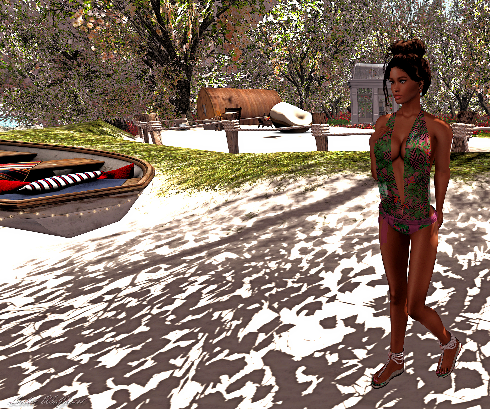 the last days were grey, rainy and not very moody to show it’s spring face. So I am happy that in Second Life we can have what is not able to in RL. I went out with my sweeties and enjoyed the warm breeze at my beach. Also a great opportunity to wear the newest creation of Luxe Paris Fashion house named ‘Sunflower’. You get a top with the precious sunflowers on it with the palazzo pant that gives you a elegant way to go to parties or an evening out with friends. The sizes are for Slink, Belleza, Legacy and Maitreya. About the animals I tell you in another blog more but for now let me tell you they are from Rezzroom.